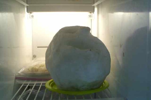 This is what happens when your child is an artist too. You find things like this in your freezer (in addition to messes left behind from the last endeavor involving chocolate). It’s a “portrait” created after our last snowstorm. (I’m glad she’s just a child and her icy portraiture impulses haven’t manifested to the extreme of Marc Quinn, who periodically casts a self-portrait out of his own blood, then freezes it for posterity and display, fetching hundreds of thousands from collectors.)