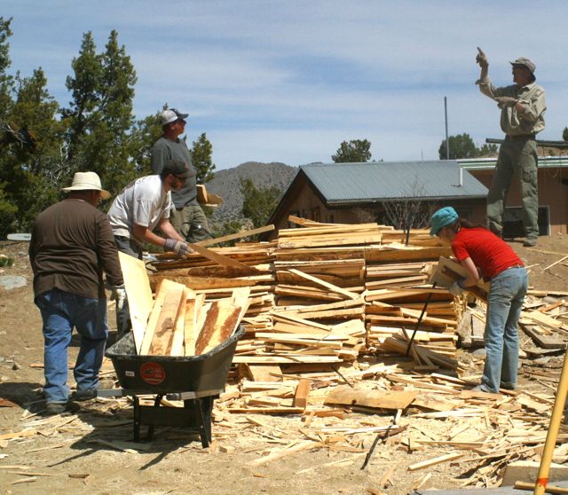 The first step in this labor-intensive firing process is wood prep. Yesterday, the ten of us who are firing spent four hours cutting, sorting, and stacking 5 cords of scrap lumber from the Spotted Owl lumber mill in Santa Fe. (The wood is free but there is a charge for delivery to the kiln site.) We’re thankful to put this scrap wood to good use rather than land-filling it. Even though wood prep is hard physical work, it’s work in the service of a great cooperative effort, and it’s always such a pleasure to reunite with pottery friends who come together for the annual festivities. Here’s how it went: