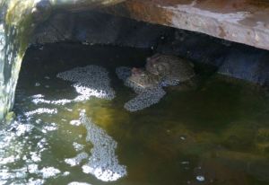 The Woodhouse’s Toad is native to New Mexico and many other parts of the South and Southwestern US. The official description says they average 4″ in length which clearly puts Mavis in a class of her own. Each Spring, we adjust once again to what sounds like old ladies screaming in the back yard: The Woodhouse’s Toad mating call. Soon after, stringy layers of eggs can be seen in the pond and they hatch within about a week. Zillions of tadpoles then appear and they spend their formative months cleaning the pond of algae. Those who survive the pump and various other pond hazards (namely, the bullfrog), develop into tiny toads that can fit on a penny. For some reason, those zillions of tadpoles usually only result in one or two toads per season, which makes me think the prey/predator relationship in our yard must be out of balance.