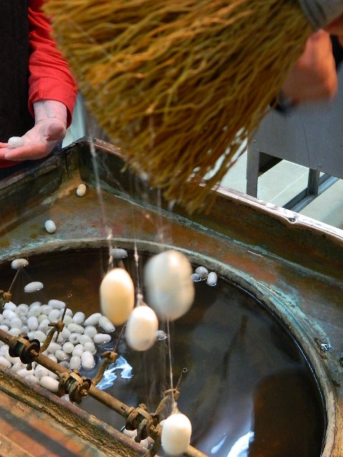 A broom is used to grab the fibers after the cocoons are boiled. Thirty-five fibers are spun together to create one silk strand.