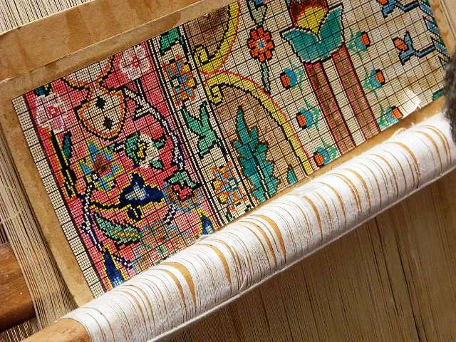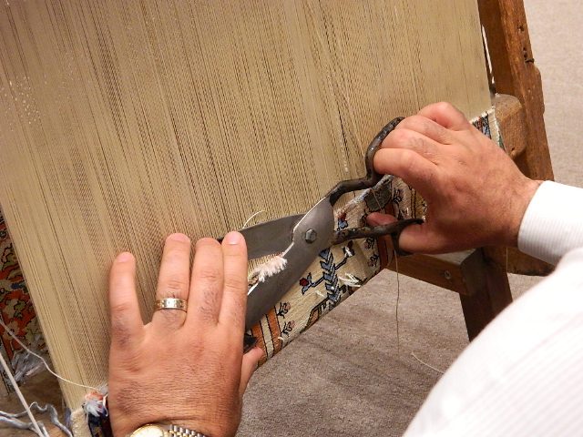 Turkish carpets are composed of various warp/weft combinations: wool/wool; cotton/wool; cotton/silk; or silk/silk. The rugs are hand-woven on looms by women using the double knot technique. Following the pattern, colored threads are looped around two weft strands in sort of a pretzel pattern, and tied tightly. Then the threads are combed down and trimmed.