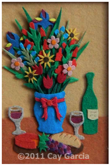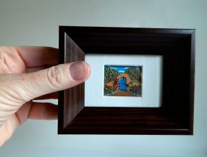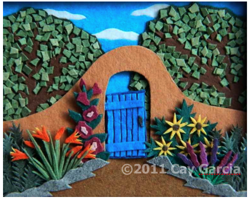 Back to art: Cay Garcia makes amazing, miniature pictures by cutting, layering, and stacking colored paper. She’s a self-taught artist who has a studio in Downtown Albuquerque not far from my own. I met Cay last summer at the Grower’s Market where she had a table with one original piece (above) and lots of reproductions including magnets, cards and prints. When I asked if she had any other jobs in addition to being an artist, she said, “Yeah, I’m a mom!” The time-consuming nature of her intricate work (sometimes up to 1,000 pieces of cut paper in one picture!), combined with the demands of motherhood, makes her original pictures rare little gems.