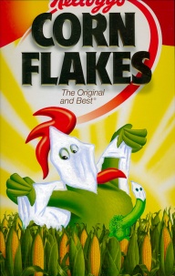 I gathered hundreds of images from the internet and artistically arranged them by food group on the pages, added Spanish and English labels… and Corn Flakes here was smack in the middle of the Cereals. At least five people had proofed it and 100 copies had already been distributed before a *daycare provider* finally saw the…really happy rooster….cock… whatever.