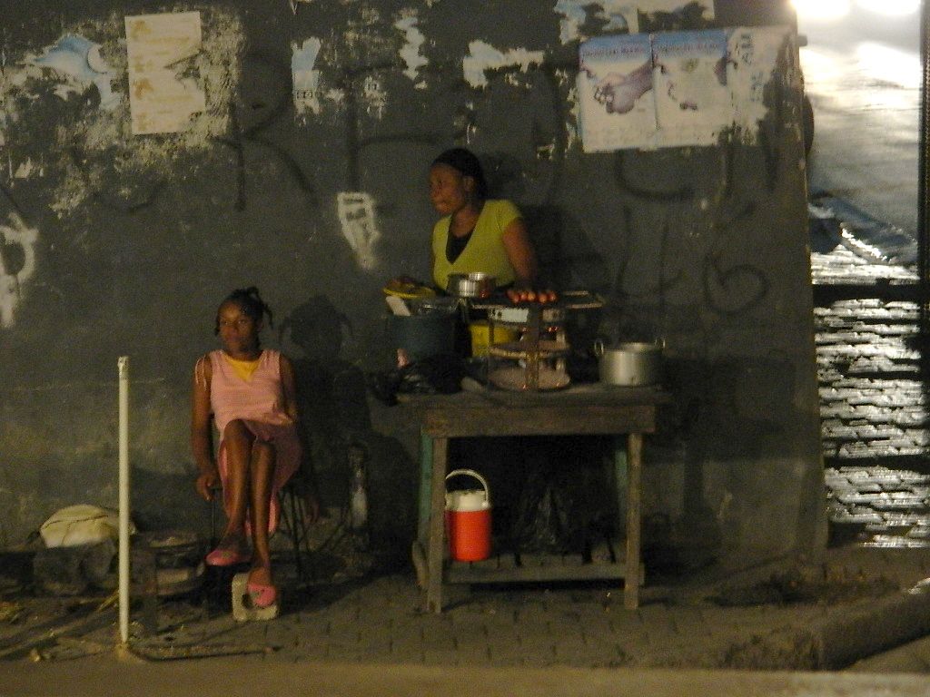 We ate dinner on the way home, not far from our hotel. There are street vendors all over Haiti selling food–cooked, packaged, dried, fresh. This woman and her daughter or friend were set up across the street from our restaurant selling hot dogs.