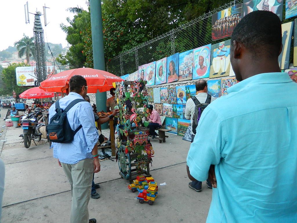 The central park in Pétionville is now a tent city. Near the park, there was a high school above a flower market and lots of people selling all kinds of art on the streets. I was shocked by how many hundreds of original paintings (not prints) covered the walls.