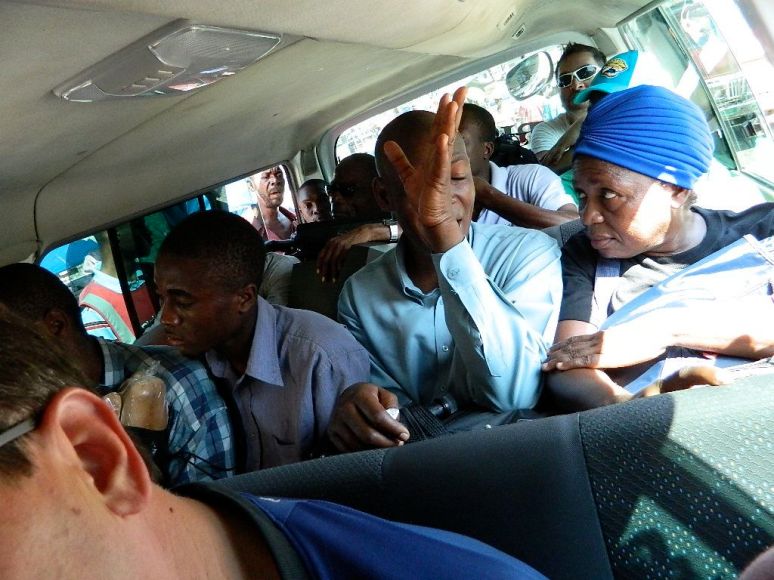 The front door of the van-bus is swarmed with people pushing to get seats, not unlike fans rushing a concert stage, and I am trapped. As I am not aggressive by nature, and sort of stunned thanks to being smacked in the face by Gabe’s backpack as he boarded (he says it was an accident), Jean-Claude advances me in the right direction. I am on the bus. People are yelling in Creole, pushing and shoving and trying to sell me things, I am hunched and hovering over a man and his box in the front seat. He’s in the middle of the seat, his box is in the seat by the window and will not move himself or his box. I am suddenly too big for the space, a great white insect with extra appendages, long and unwieldy, bottle-necked, unable to move forward or back.
