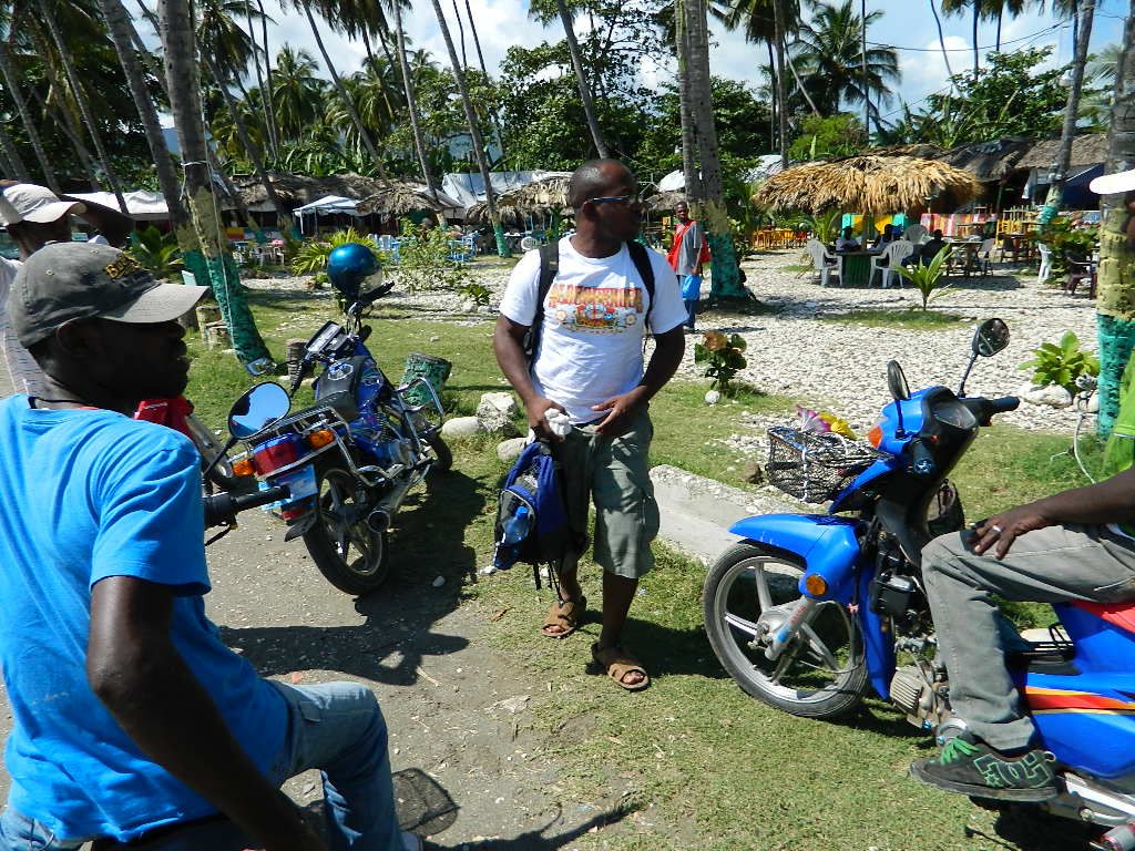 Two-and-a-half hours later we arrive in Jacmel, get off the bus, and quickly (before I have time to panic) jump onto four moto-taxis that take us to the beach. Now we’re off to see some traditional art.