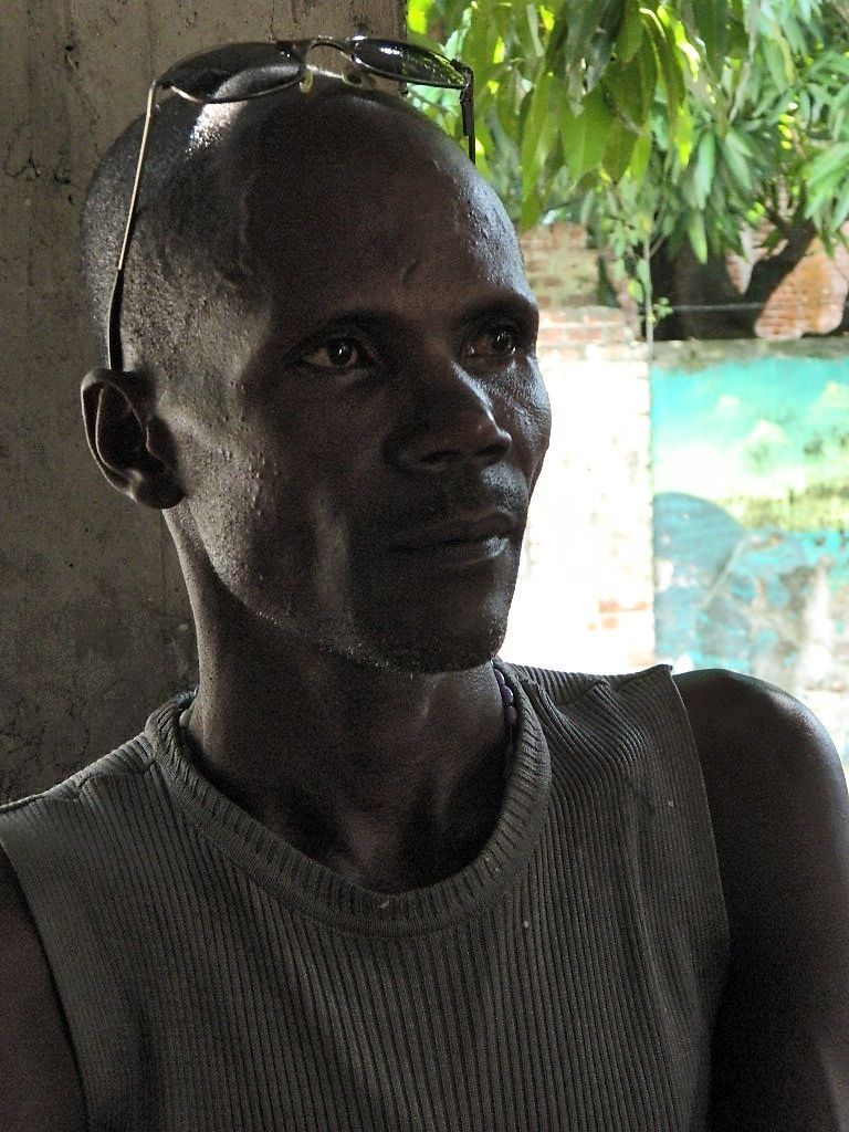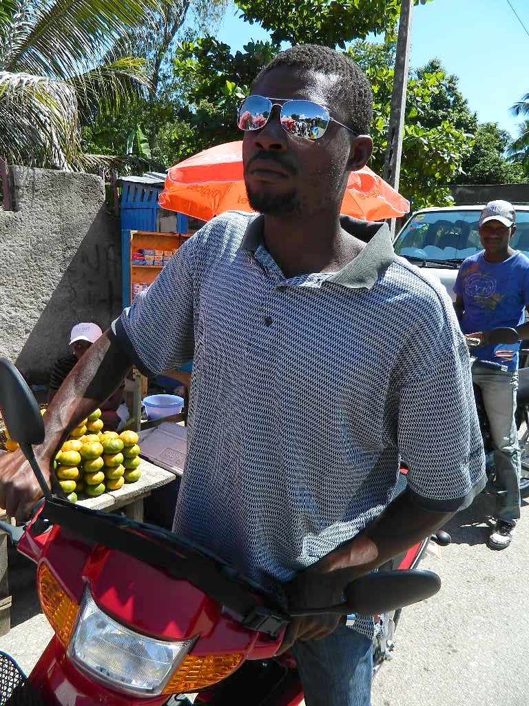 We left Jacmel around noon after buying some gorgeous art to take home, including papier-mache roosters, a hen, and a sequined Vodou flag. This was the stoic moto-taxi driver who took me back to the van-bus stop.