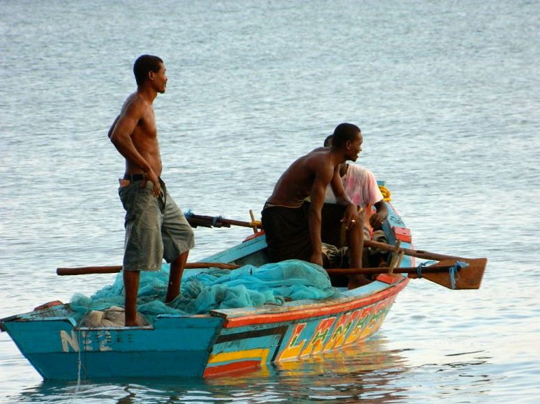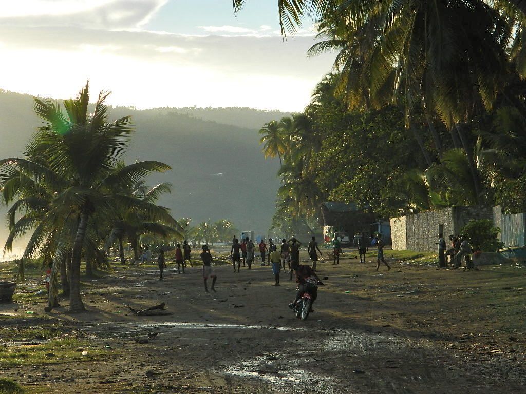 Just beyond these boys playing soccer was a row of outdoor cooking huts with tables and chairs set up under tarps and grass tiki huts. Cameron had a delicious fish ($5). I declined fish based on the presence of heads and tails and stuck with my new favorite Haitian food, fried potatoes and plantains.