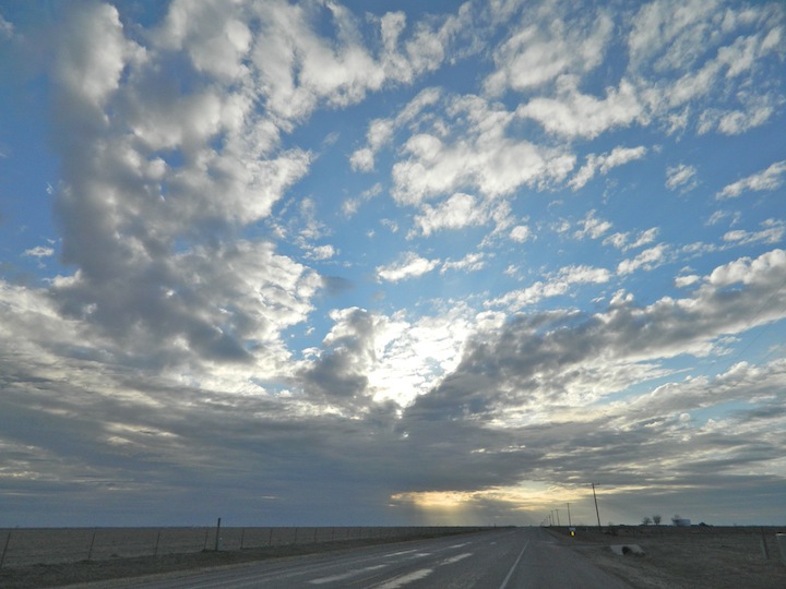 and drove 1.5 hours north to Dumas, Texas, which was surprisingly civilized*. We stayed at the pet-friendly (no extra charge!) La Quinta, where we encountered a newly remodeled pool/hot tub populated by Texans on their way to… yes, the ski slopes of New Mexico and southern Colorado! (What did I tell you!?) We had a late dinner at the 287 Roadhouse whose exotic offerings included breaded and deep-fried pickles, fried alligator bits, and “Juicy Juevos,” which is I suppose more elegant than “Fried Calf Balls.”