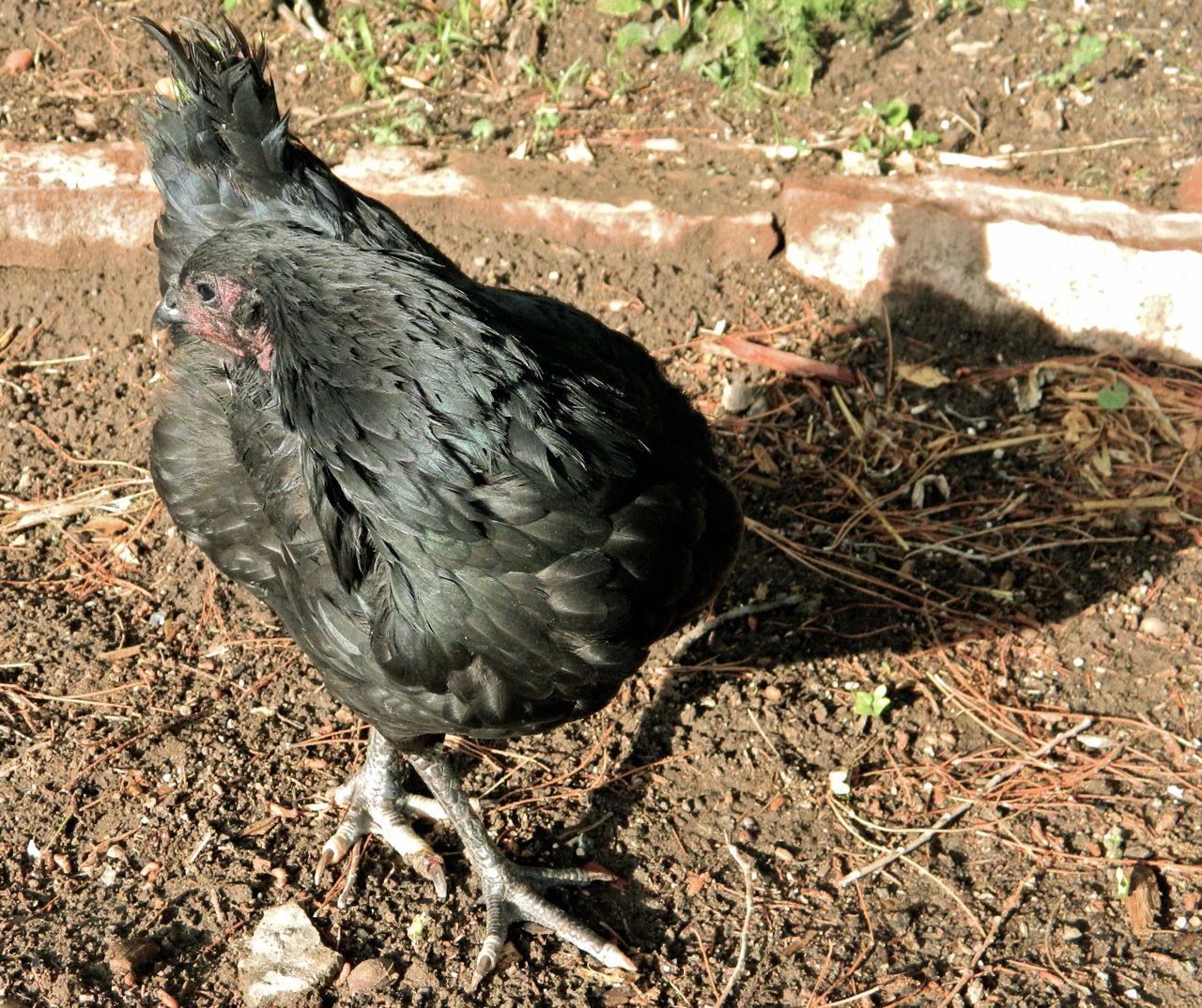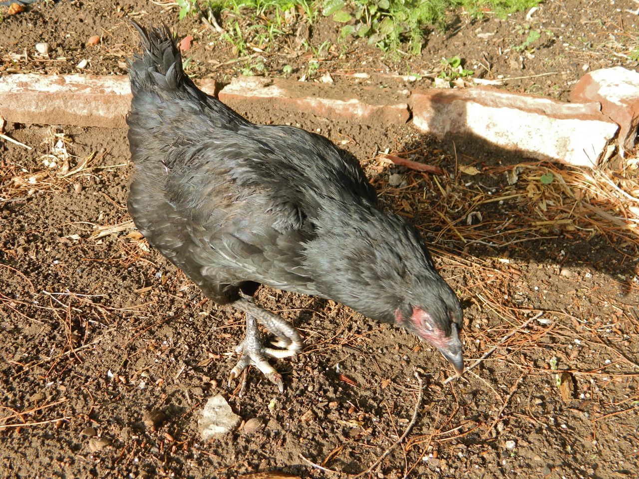 But that does not prevent her daily forays into the garden where she walks around with her head craned forward to “feel” where she’s going, and from exhibiting other persisting chicken qualities that seem to evidence a contented life.