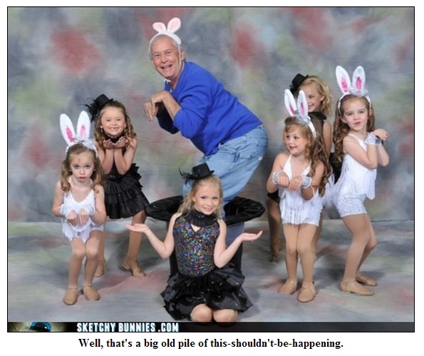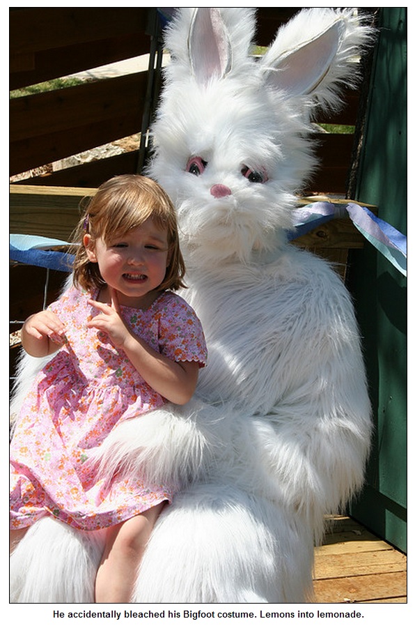 The thought of a man only partly dressed as a bunny is the creepiest of all (as in #7-17-28). Yet, then there’s Santa Claus, who is always a dude? Personally, I think it has something to do with the fact that rabbits are normally prey, but as a giant-sized costume, they seem more predatory. Like if giant gerbils were attached to a holiday.