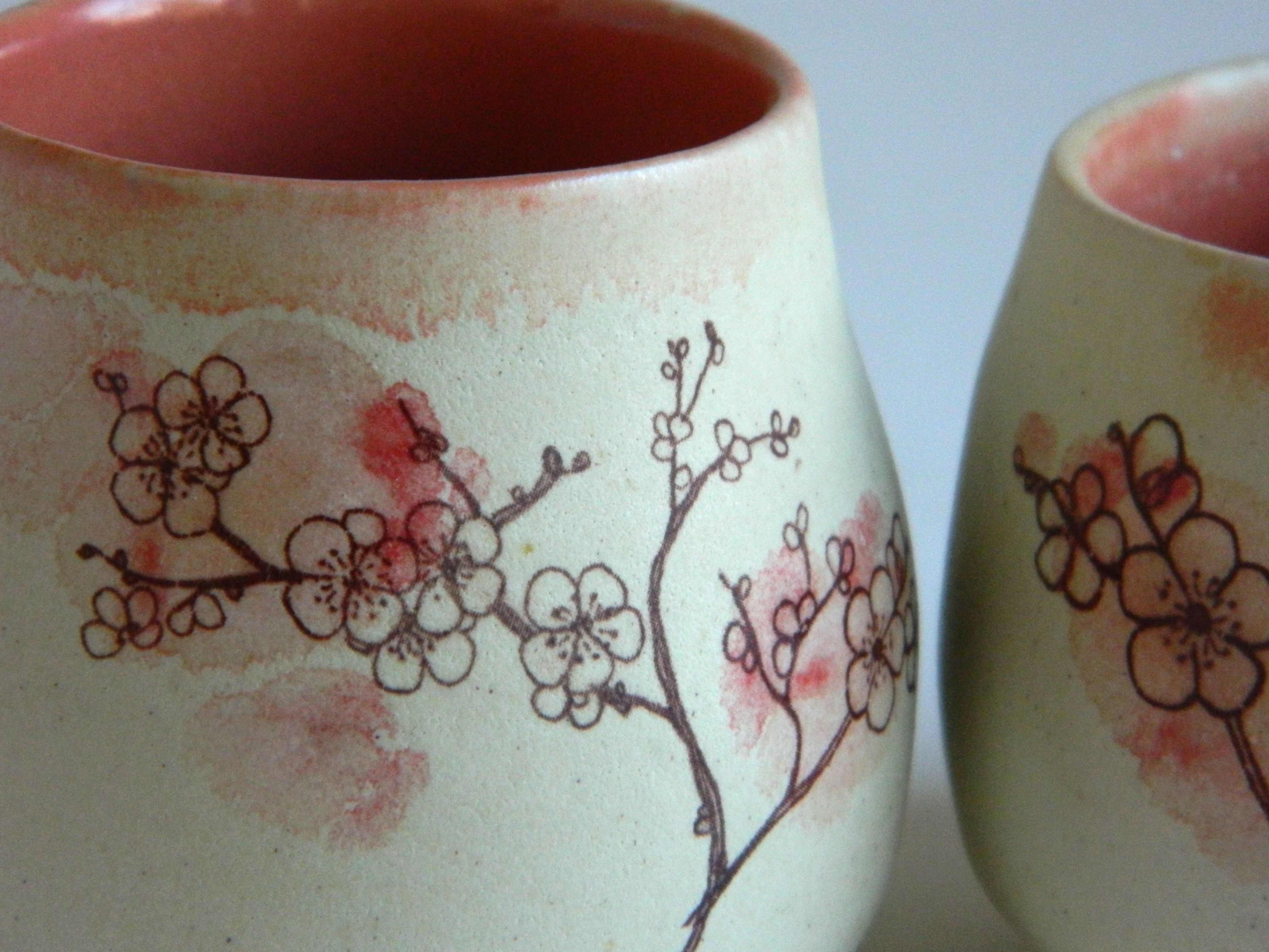Red Poppies Urn with matching Toasting Tumblers, 7.5″h x 7″w / tumblers 4″h, stoneware with original decals