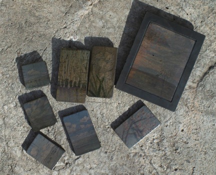 I just took the tiles out of the trash can filled with sawdust. The smoke and fire inside the can turn the unglazed clay black and coat the surface with carbon that needs to be scrubbed off.